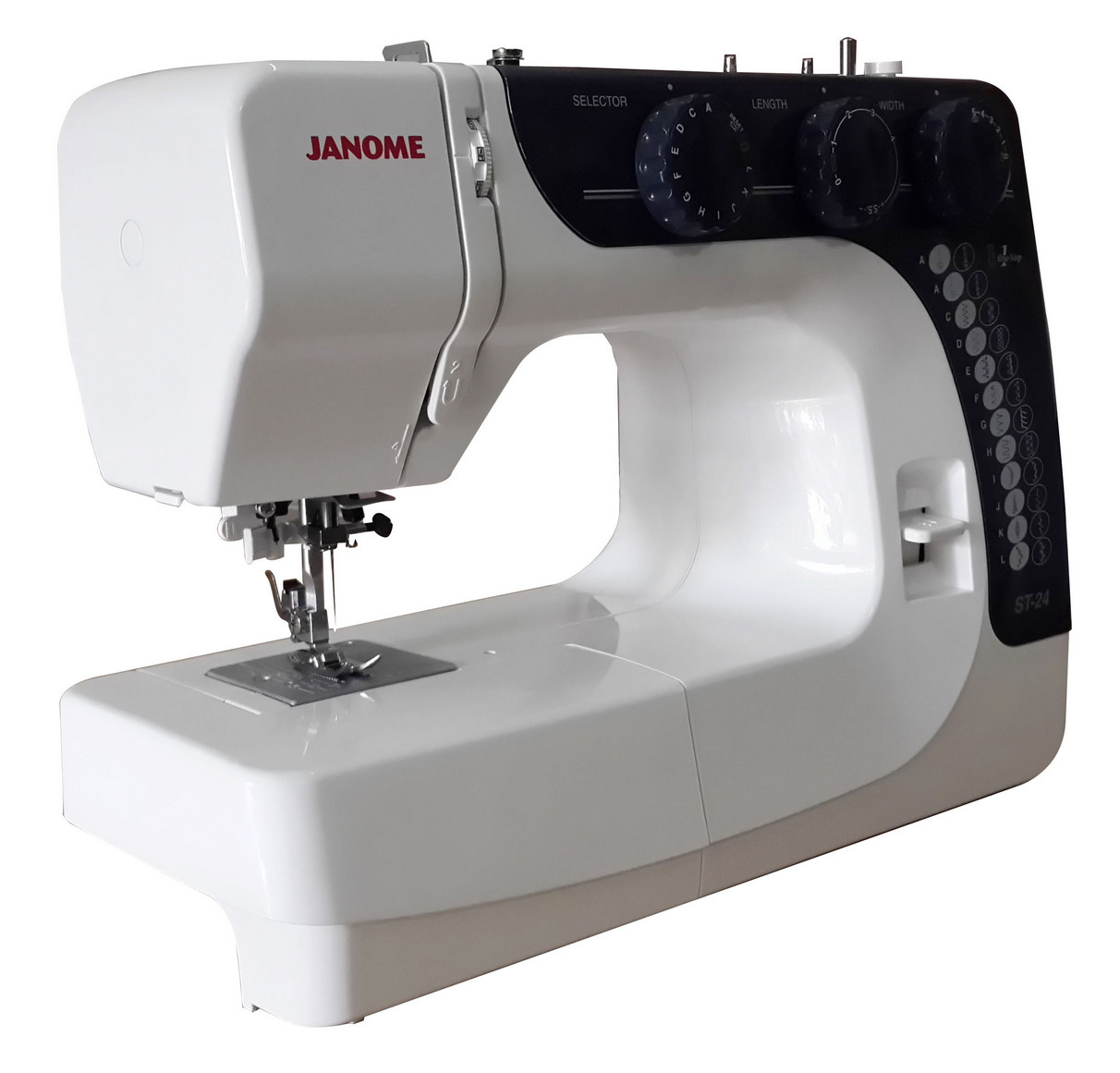 Janome ST24 Dilengkapi Dengan Fitur Tiga Tombol,Mulai dari Tombol Selector,Length,dan Witdh.