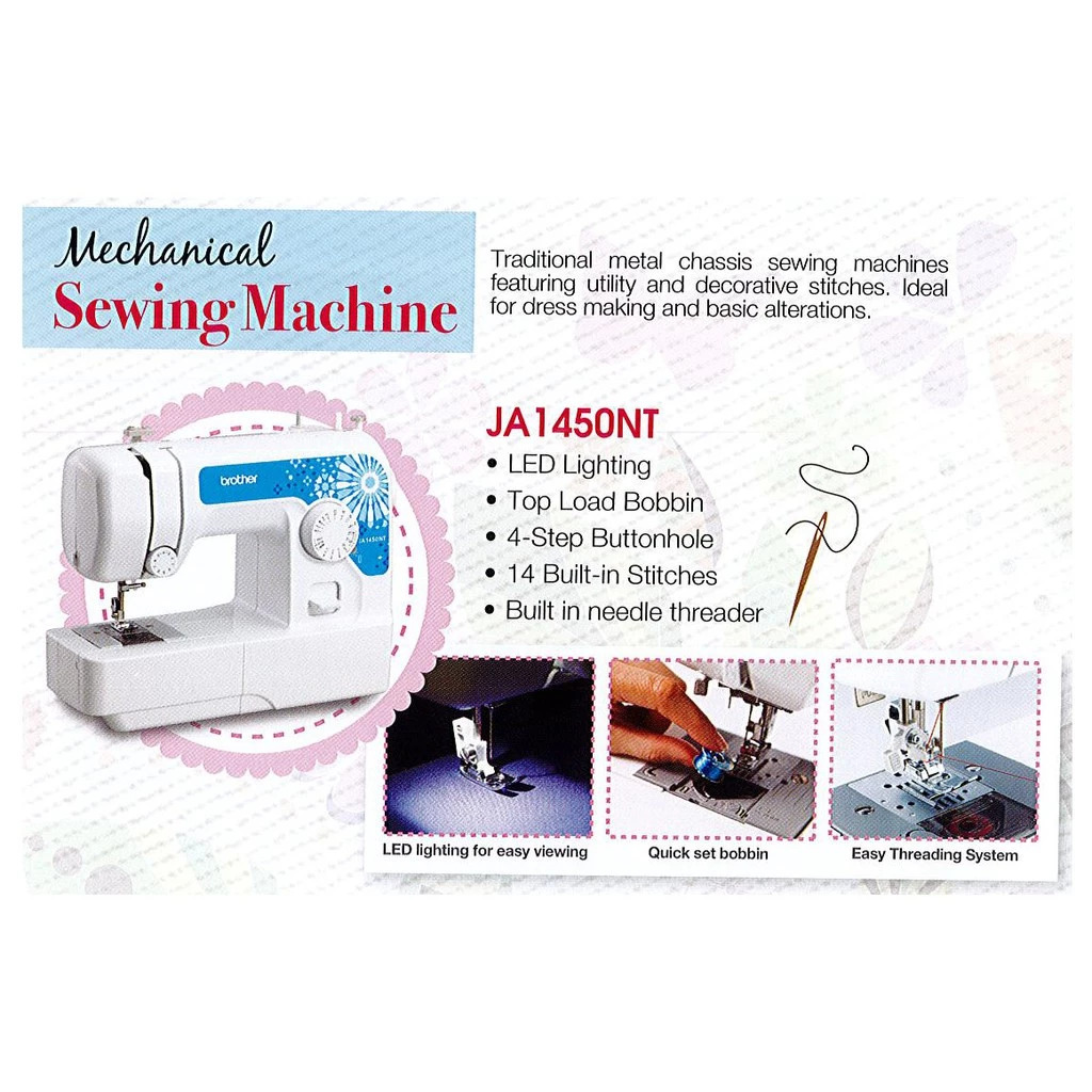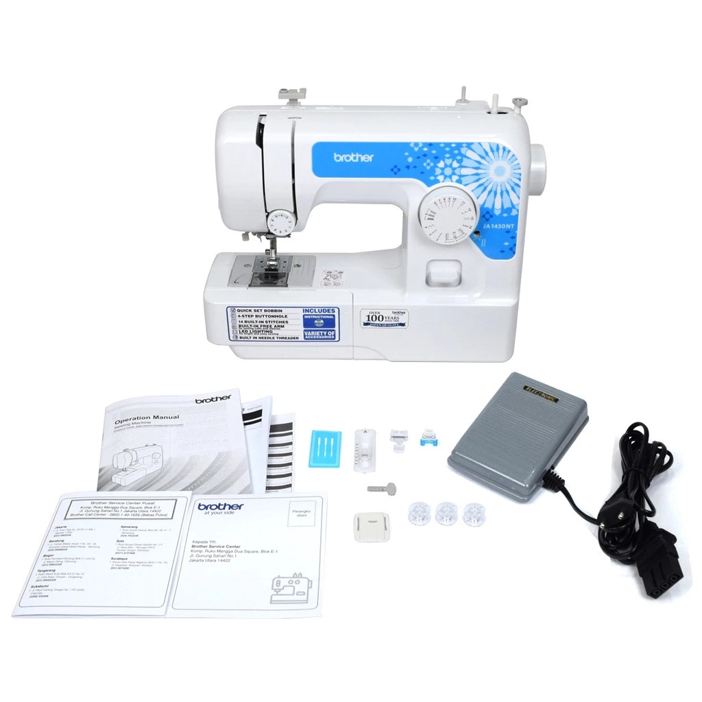 Merk : BROTHER (JAPAN) Tipe : JA 1450NT Made In : Vietnam Kelas Mesin : Portable Multifungsi* Spek - 14 fungsi jahitan built in - Auto Needle Threader / Pemasuk Benang Auto - Dengan Meja Tambahan untuk kenyamanan saat menjahit bahan-bahan bidang lebar - 4 step membuat lobang kancing - Free Arm Sewing - Mesin Halus Getaran Rendah - Low Wattage (51 Watt) - Sistem Bobbins Top Load/Bobbin Atas - Pengaturan Panjang Jahitan hingga 4.0 mm - Pengaturan Lebar Jahitan hingga 5.0 mm - LED Lamp built in KELENGKAPAN DALAM KEMASAN - 1x Unit Mesin BROTHER JA 1450NT - 1x Meja Tambahan / Extension Table BROTHER JA 1450NT - 1x Semi Hard Cover BROTHER JA 1450NT - 1x In-Built BROTHER Motor 51 Watt - 1x Foot/Pedal Controller - 1x Booklet Instructions Manual & DIY Project Manual (English) - 1x DVD Manual Instructions - 1x Tool Kit Set Standard (Sepatu Lobang Kancing, Sepatu Zipper, 3 pcs Bobbins, Jarum, Jarum Ganda. Obeng, Spool Pin) - 1x Kartu Garansi Resmi 3 Tahun Brother Indonesia